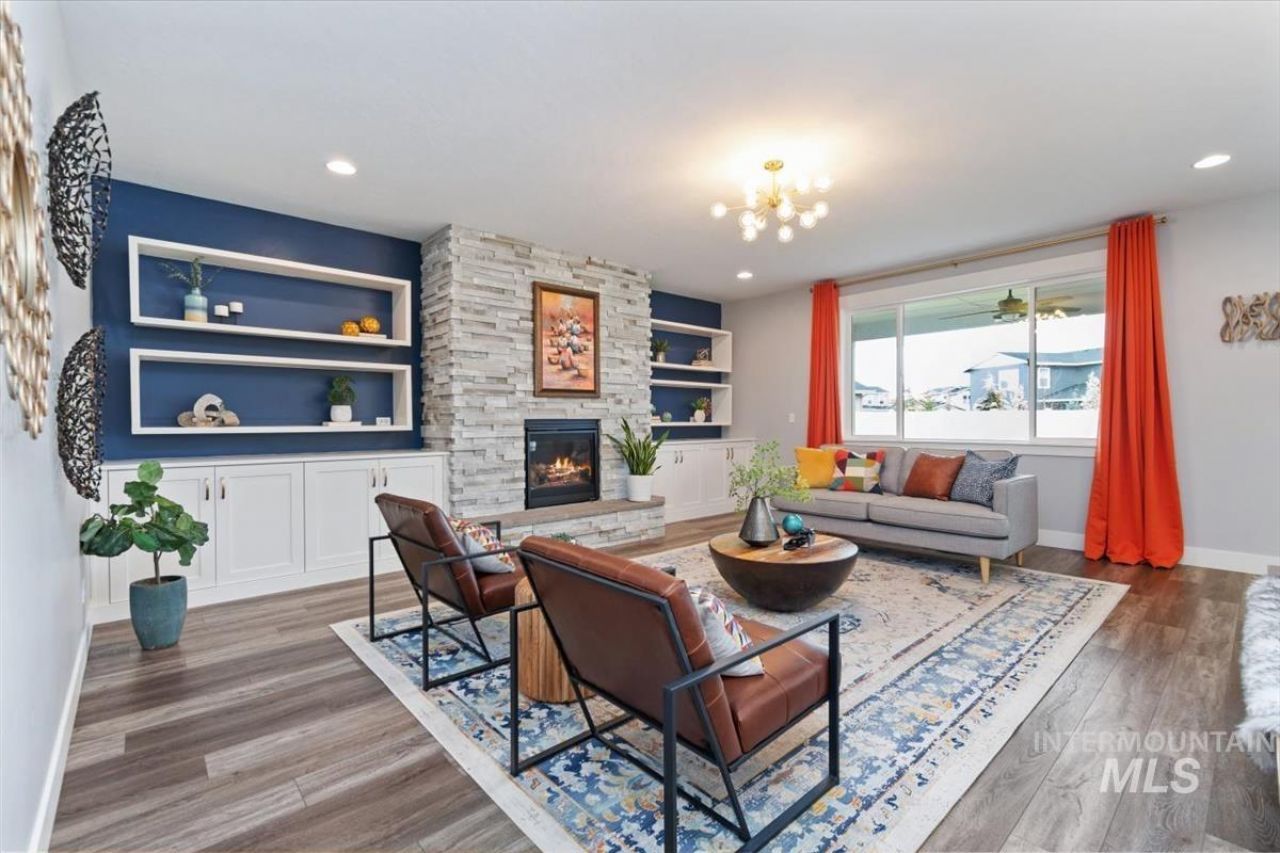 Thoughtfully designed with style & function in mind, this 4 bed/2.5 bath +office+bonus nearly 3200 sf home on .35acres built in 2023 offers elevated finishes, generous space & versatile split floorplan. The first thing you see is the oversized 3 panel glass doors that open wide to the back, creating seamless indoor/outdoor living. Great room is anchored w/stunning stone fireplace, custom built-in shelving & designer accent backdrop.The kitchen is designed to impress w/quartz countertops, soft-close cabinetry, farmhouse sink, gold hardware, ornate backsplash, lighted glass-front cabinets & thoughtful upgrades like pot filler, pull-out drawers & built in oven combo.The primary suite is a true retreat w/spa-inspired bathroom w/walk-in shower featuring elegant wave-textured tile, rain shower head, large soaking tub, separate his & hers vanities plus custom-designed closet system. Addtl highlights include dedicated office w/double glass doors, upstairs bonus room, mud bench & spacious laundry room.Outside, enjoy the extended covered patio spanning entire home, permanent holiday lighting, garden space, decorative curbing & hot tub.The oversized 4-car garage, RV gate w/large parking area & RV plug-in provide ample room for toys & storage.Community pool, park & playground plus quick access to I-84. This home blends comfort, function & smart upgrades in one exceptional package. Welcome Home!